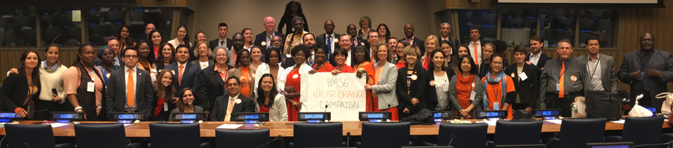 Diane (helping hold BMS6 sign) and Bill Durston (behind Diane) wearing orange with other IANSA members at the 2016 UN BMS6 conference